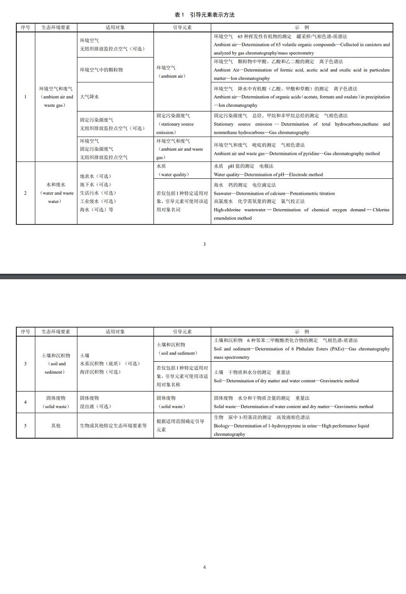 其中,主體元素由監(jiān)測項目和監(jiān)測目的構(gòu)成,引導元素未充分體現(xiàn)生態(tài)環(huán)境要素特點時,可在主體元素中補充說明。主體元素中監(jiān)測項目包括化學元素、化合物、混合物、生物體或特性等,應優(yōu)先選擇通用的規(guī)范名詞。