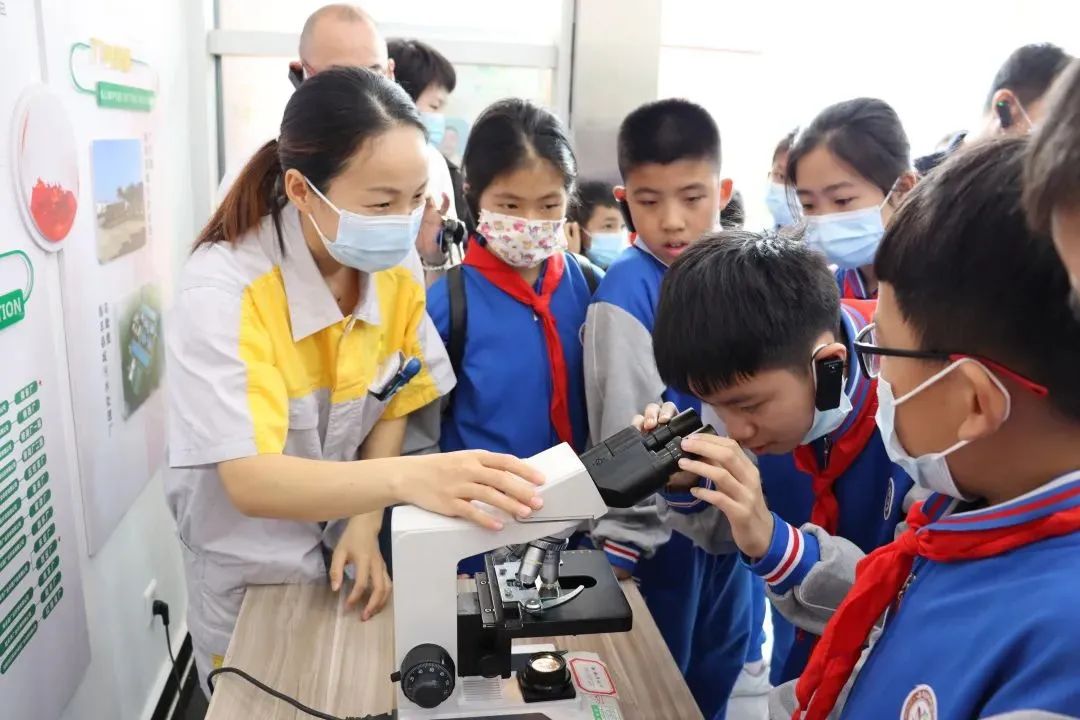 △工作人員為小學(xué)生講解污水處理過(guò)程