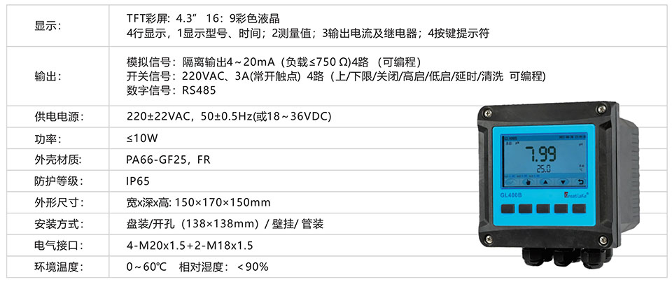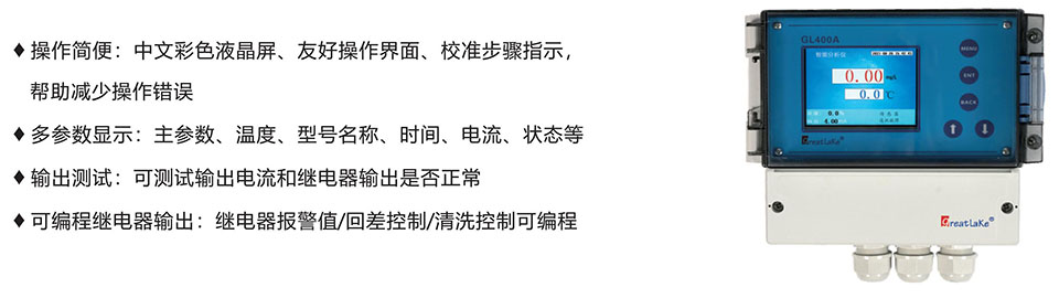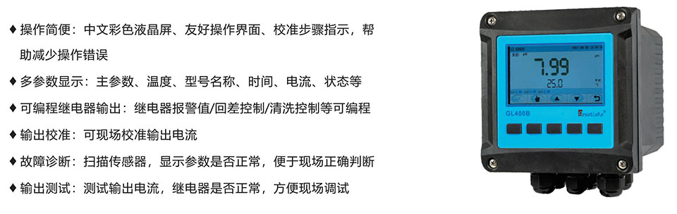 產(chǎn)品簡介: 智能分析儀GL400A他的功能特點有:中文彩色液晶屏、友好操作界面、校準(zhǔn)步驟指示,幫助減少操作錯誤;主參數(shù)、溫度、型號名稱、時間、電流、狀態(tài)等;可測試輸出電流和繼電器輸出是否正常;繼電器報警值/回差控制/清洗控制可編程